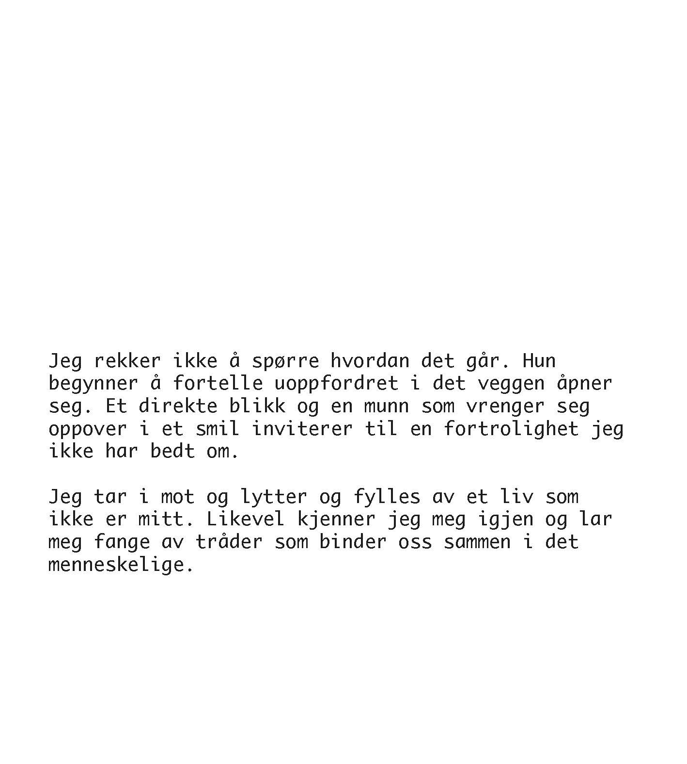 Et lite utvalg av tekster og foto fra mine vandringer i Oslos mindre prangende og gjestmilde områder, men som likevel tjener noens behov. I disse midlertidige byrommene finner jeg spor etter mennesker som har hatt tilhold der i en periode før de fortsetter sin rastløse, nomadiske reise. Jeg har i løpet av mange år samlet et betydelig arkiv av foto og tekster med observasjoner og betraktninger over livet på disse stedene, og av en by i endring.